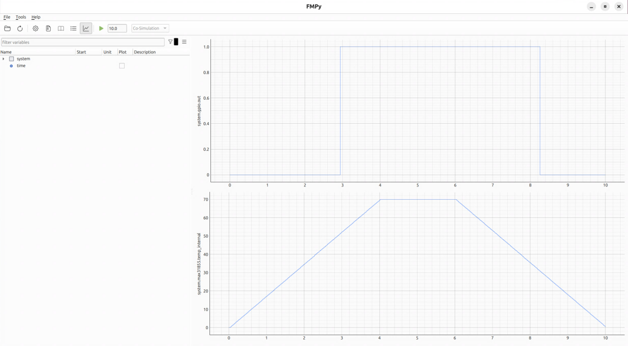 To achieve this, we first need to build our FMU. This involves providing configuration options, such as specifying which VP’s variables and properties we want to access via FMI. With this information, our exporting tool generates an FMU that can be directly loaded by an importing tool such as FMPy. Once the VP is manually started, the simulation can commence with our specified input values. The simulation results, clearly shown in Screenshot 1, demonstrate that the VP behaves exactly as expected. The bottom graph displays the temperature curve of the virtual temperature sensor, while the top line indicates the corresponding value of the GPIO output pin. As the temperature rises above 50°C, the GPIO pin is set, and it remains set until the temperature drops below 30°C, at which point it is unset again. This successfully proves the intended Schmitt-trigger functionality.