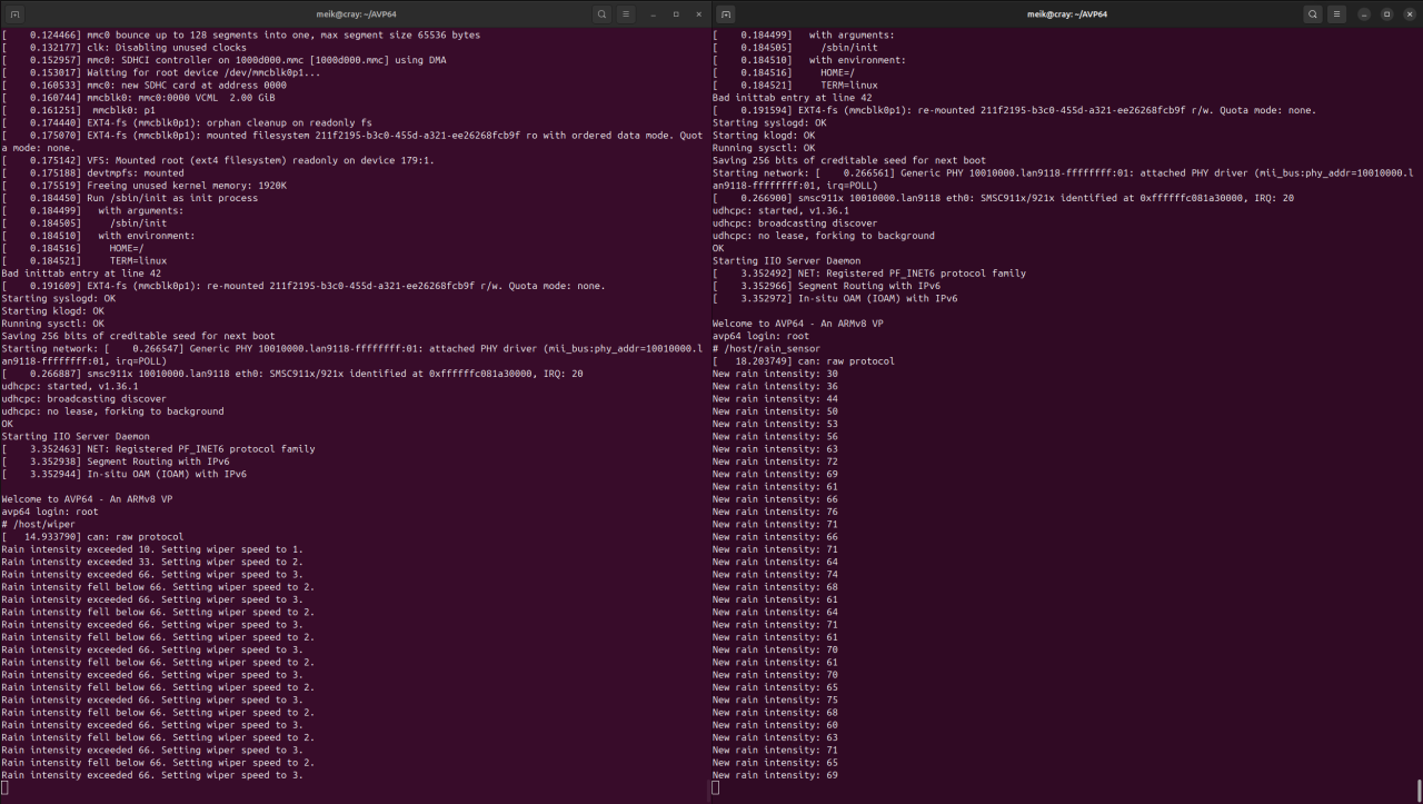 Once booted, these VPs execute distinct user-space processes that seamlessly exchange relevant CAN messages over the virtual bus. One VP emulates the behavior of the rain sensor, transmitting real-time rain intensity values to the virtual CAN bus. Concurrently, the second VP acts as an vECU of a responsive car windshield wiper system, dynamically adjusting its speed in response to the received rain intensities from the rain sensor. The behavior of both VPs is clearly displayed in Screenshot 2, where the left terminal shows the windshield wiper VP's speed adjustments and the right terminal showcases the rain sensor VP's continuous output.