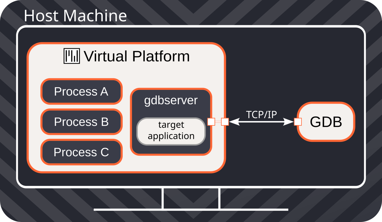 This opens a TCP port in the VP, which is forwarded to a local port on the host machine. This setup enables a standard GDB session for our target architecture, allowing us to connect to the forwarded port and debug the application running within the VP as if it were running natively on the host PC. This configuration is illustrated in Figure 1.